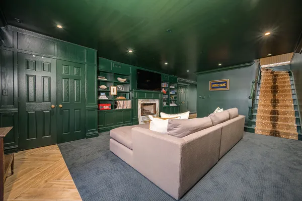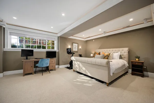 The second floor offers three bedrooms, including an expansive primary suite with fireplace, generous closet space, and large attached primary bathroom. Stunning original, wide plank hardwood floors, two additional spacious bedrooms, a hall bath and upstairs laundry round out the charming top floor. The lower level is designed for comfort and entertainment, featuring radiant heated floors, a large open family room with custom built-ins, another fireplace, two large storage rooms and an extra large bedroom with an ensuite full bathroom perfect for guests.